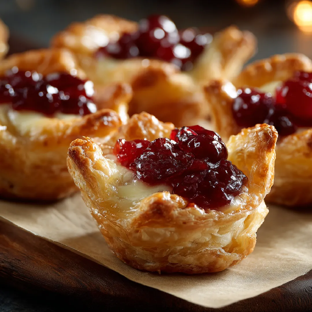 Flaky, golden puff pastry cups filled with creamy brie and tart cranberry sauce, these Baked Cranberry Brie Bites are the perfect festive appetizer for holidays and parties.