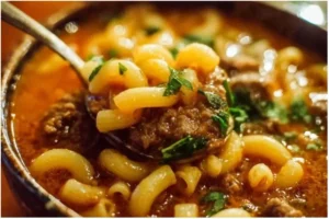 This soup mixes ground beef, tomatoes, vegetables, and elbow macaroni. You get a rich broth and soft pasta in one pot. The recipe cooks fast and makes good leftovers. It works for families and for meal prep.