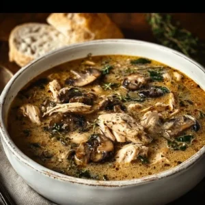 A warm and comforting soup with tender shredded chicken and earthy mushrooms in a rich, creamy base.