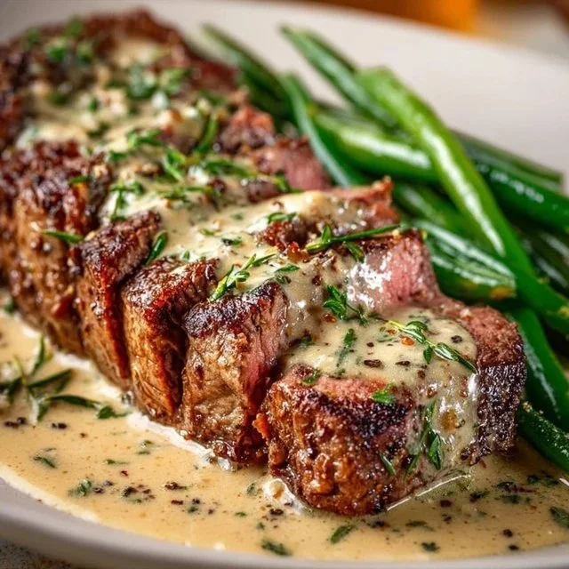 9. Slice the steaks, plate them, and drizzle the Parmesan cream sauce over the top. Garnish with chopped parsley.