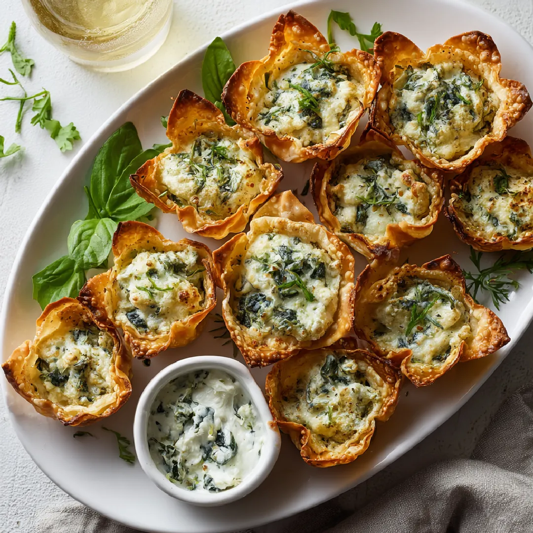 Crispy wonton shells filled with creamy spinach and artichoke dip, baked golden for the perfect appetizer.
